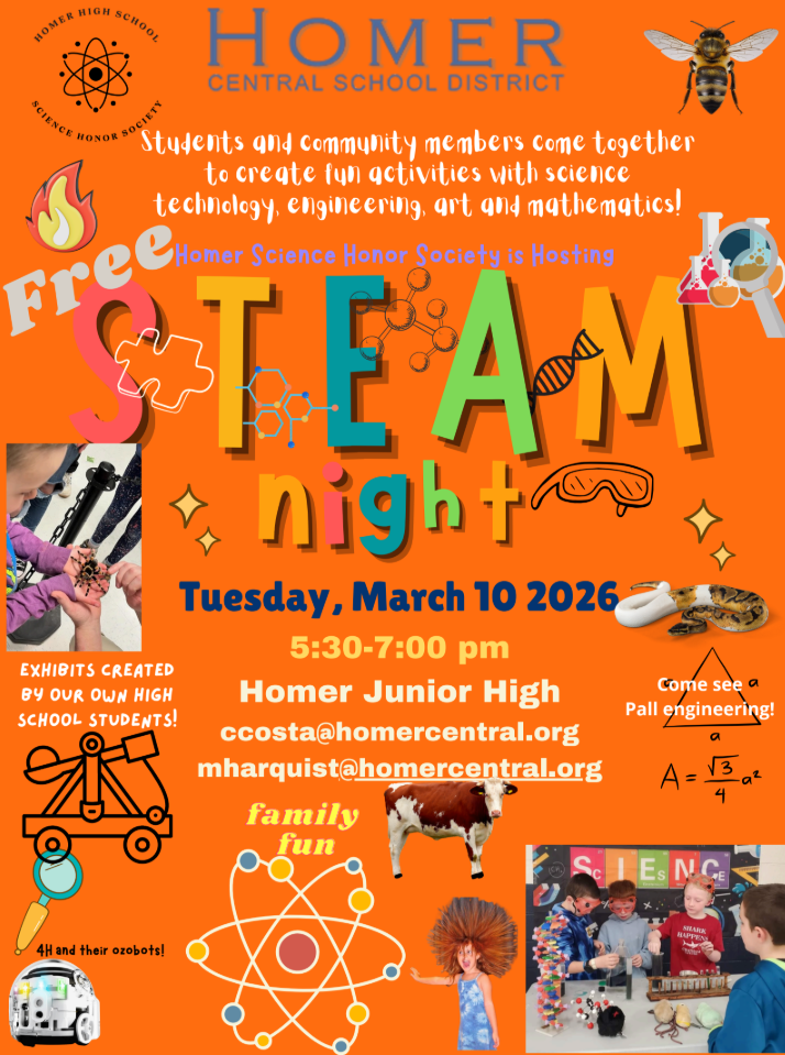 🚀✨ STEAM NIGHT IS BACK! ✨🚀Tuesday, March 10th from 5:30-7:00 at the Junior High. Join us for a FREE, family-friendly evening of hands-on fun at our Annual STEAM Night!Hosted by the Homer High Schoo...
